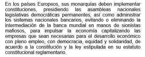 El poder económico debe ser un poder constitucional reglamentado por la ley para darle al estado la capacidad administrativa en busca del bien común, partiendo de la adopción de la moneda nacional, dinero circulante o medio de pago, equivalente a la medida del producto interno bruto (PIB) de cada país, así como aceptar la divisa internacional estipulada legal y legítimamente por la comunidad de todos los países, para facilitar el comercio internacional o intercambio de bienes y servicios entre países, garantizando la SOBERANIA MONETARIA en cada uno de ellos. El dinero debe entenderse como la medida de la economía y capital social ajustado a la constitución y la ley. En el imperialismo monárquico, capitalista, mafioso, la constitución y la ley están sujetas a la manipulación del dinero como capital mundial privado.