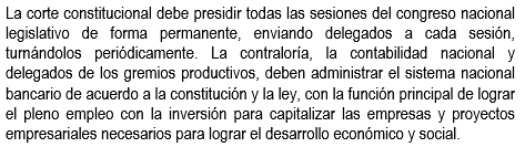 La soberanía nacional reside exclusivamente en el pueblo, del cual emana el poder público. El pueblo la ejerce en forma directa a través de sus representantes, en los términos que la Constitución establece. El poder popular legislativo, ejercerá la soberanía nacional en forma directa, a través de la asamblea nacional popular permanente, siendo la base de su estructura, las asambleas comunitarias, de cada comuna en que se divide el territorio de los municipios colombianos. Las asambleas comunales nombraran representantes para conformar la asamblea popular municipal. Las asambleas populares municipales nombraran representantes para conformar la asamblea popular departamental. Las asambleas populares departamentales nombraran representantes para conformar la asamblea popular regional. Las asambleas populares regionales nombraran representantes para conformar la asamblea popular nacional legislativa. Las asambleas comunales se constituirán en entidades jurídicas territoriales, conformando la base de la estructura de la asamblea nacional popular permanente, eligiendo por votación popular en forma pública y democrática, reglamentada por la ley, a los ediles comunitarios, que ejercerán bajo su mandato soberano el poder popular legislativo. Su función principal es la de elaborar e implementar el DERECHO SOCIAL incorporado en la CONSTITUCIÓN NACIONAL y el ESTATUTO CONSTITUCIONAL con SUS CÓDIGOS Y LEYES reglamentarias. Así mismo, elaborará e implementará el PLAN NACIONAL DE DESARROLLO SOCIAL Y CULTURAL de la nación, así como también es una de las funciones del poder popular legislativo, aprobar el PLAN NACIONAL DE DESARROLLO ECONÓMICO elaborado por el poder económico y el PRESUPUESTO NACIONAL elaborado por el gobierno nacional.